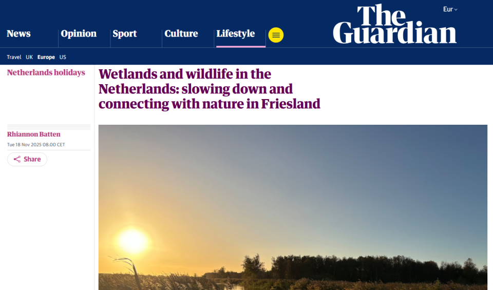 Trots op prachtige publicatie over De Alde Feanen in The Guardian We zijn ontzettend trots dat Nationaal Park De Alde Feanen schittert in een uitgebreide reisreportage in The Guardian. In het artikel, gepubliceerd op 18 november 2025, neemt journalist Rhiannon Batten haar lezers mee op een winterse ontdekkingsreis door ons unieke natuurgebied. Ze beschrijft De […]